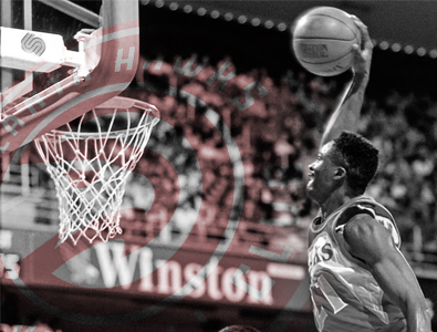 1990年,亚特兰大老鹰队的多米尼克·威尔金斯击败萨克拉门托国王队的肯尼·史密斯,赢得了他的第二个NBA扣篮大赛冠军。这也是他在比赛中首次战胜NBA历史巨星乔丹。史密斯以其标志性的扣篮方式获得了高分:他首先背对篮筐,将球从两腿之间向后弹起,然后转身在空中接球,完成反向扣篮。