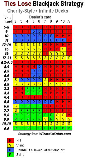 就是这样。我假设庄家在软17点停牌,并在允许分牌后加倍。为了简单起见,我假设牌堆数量无限。此策略与8副或更少牌堆之间的差异非常小。假设无限牌堆,赌场优势为9.36%。