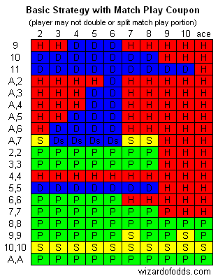 这取决于玩家是否被允许加倍或分牌投注的比洞赛部分。通常情况下,玩家不允许这样做,这对玩家不利。下表展示了如何调整你的加倍和分牌策略,假设玩家不能加倍比洞赛部分,并且如果玩家分牌,则比洞赛部分将保留,基于无限牌堆和庄家在软17点停牌的情况。要牌/停牌策略相同。