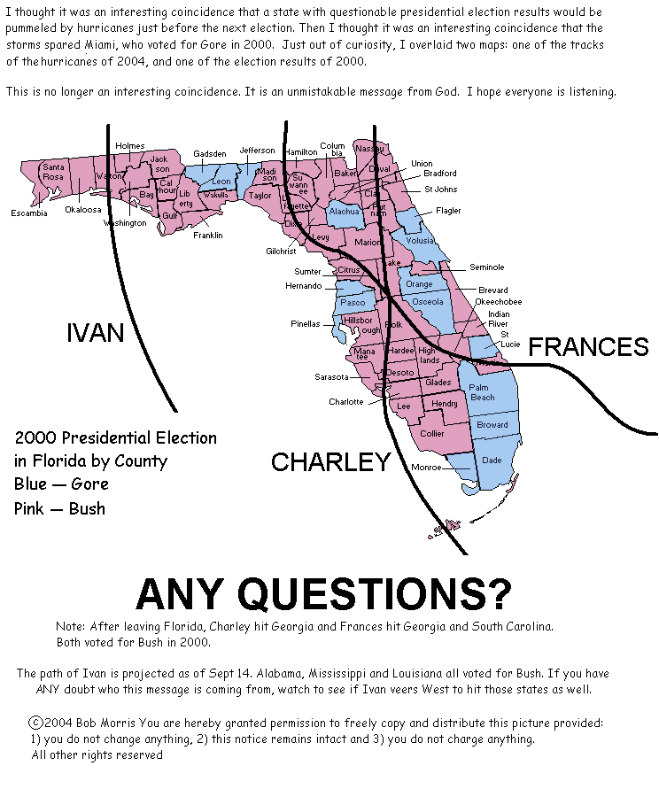 您如何看待下面的说法:上帝是民主党人,因为 2000 年投票支持戈尔的所有县都没有受到最近袭击佛罗里达州的三次飓风的影响?