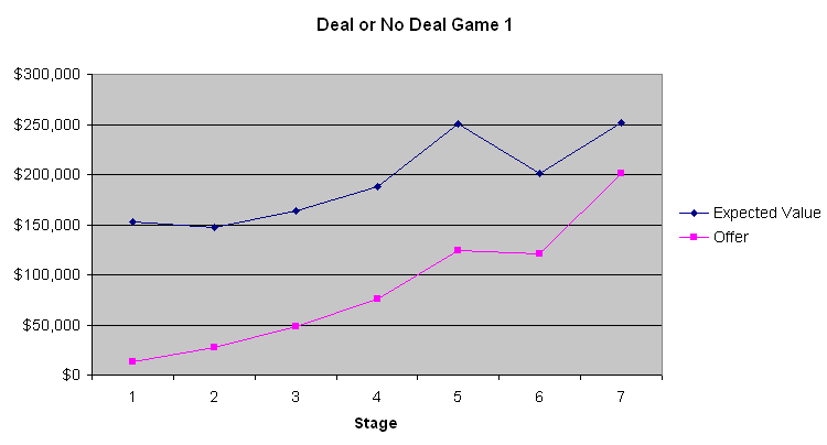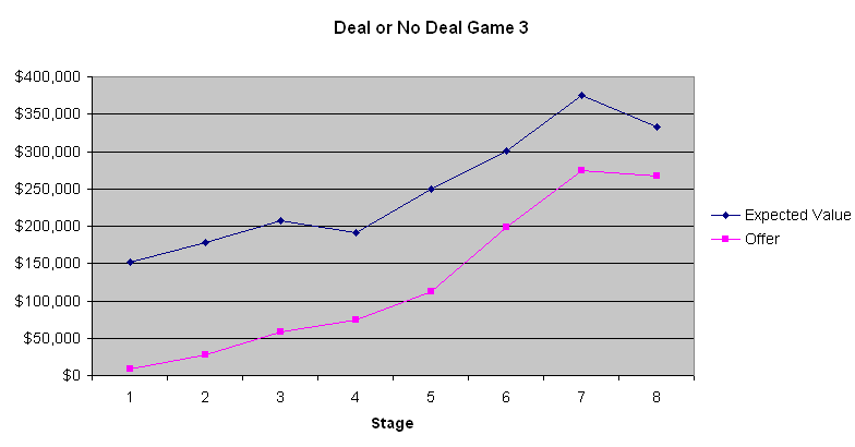 从这三张图表中,最明显的一点是,银行开出的前四到六个出价都很糟糕。平均每个箱子在开箱前有131,477.54美元。第一阶段只出价9000到13000美元,只有傻瓜才会这么做。然而,出价逐渐上升。第二局游戏显示,当玩家的预期值相当低时,预期值在游戏接近尾声时几乎与银行家的出价相同。然而,在第一局和第三局游戏中,当预期值较高时,银行家显然试图利用大多数人在涉及大额赌注时规避风险的天性。我不知道这是否重要,但第二局的参赛者似乎是一个想要大赢的赌徒。根据主持人通过电话与银行家沟通的评论,银行家似乎确实会考虑参赛者的言行举止。如果我是银行家,我也会这么做。
