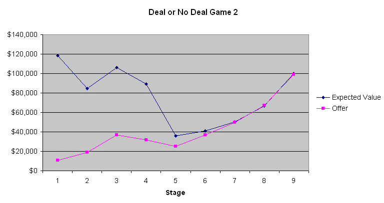如果玩家既不厌恶风险也不倾向于风险,并且不考虑税务影响,那么玩家应该不断拒绝银行家的报价,直到其中一个报价超过剩余行李箱的平均数。对大多数人来说,所得税法的累进性质有利于接受交易。正如我之前所说,我粗略地说,货币的价值与金额的对数成正比。因此,你投入的财富越多,你就越倾向于冒险拒绝银行家的报价。由于涉及的金额如此之大,没有一种策略适合所有人。不过,我可以相当肯定地说,玩家应该拒绝前四到六个报价,然后根据具体情况(双关语)接受其他报价。