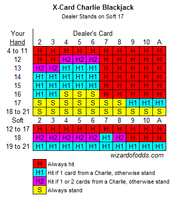 不客气。对于那些可能不明白这个问题的读者,“查理”规则是指玩家只要拿到一定数量的牌(通常是五到七张)且没有爆牌,就自动获胜。下表针对三张或三张以上的牌,展示了当玩家距离这种自动获胜者只差一两张牌时的基本策略。