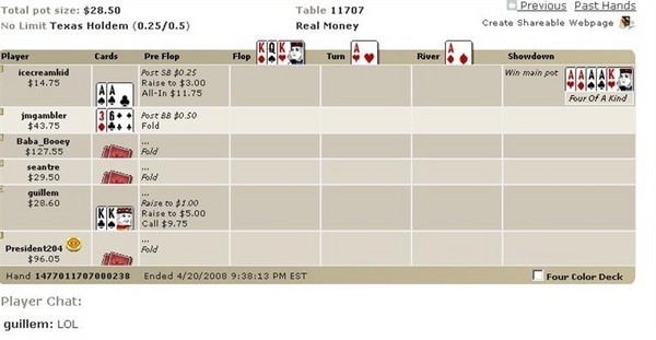 通常情况下,我厌倦了关于爆冷门(bad beat)的问题,但这道题实在太难了,我实在无法忽视。在一场双人游戏中,如果双方都有底牌对子,那么在第一张牌发出之前,四张K被四张A击败的概率是 2 * combin (4,2) * combin (4,2) * 44 / ( combin (52,2) * combin (50,2) * combin (48,5)) = 2 * 6 * 6 * 44 / ( 1326 * 1225 * 1712304) = 877,961,175 分之一。这是一场六人游戏,所以共有 combin (6,2) = 15 种不同的玩家对子。在六人游戏中,这个概率要高出 15 倍,即 58,530,745 分之一。发出所示底牌后,翻牌前,该手牌以原样结束的概率为 38,916 分之一。