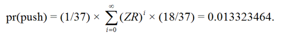 最后,有些赌场会忽略第一个零之后的零,因为第一个零会限制赌注。在这种情况下,平局的概率就是 (1/37)×(1/2) = 0.0135135135。