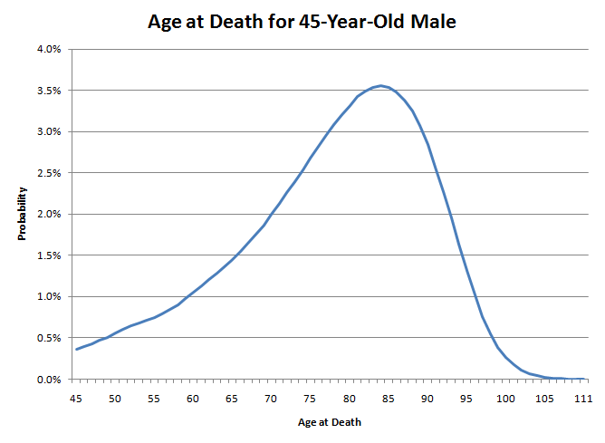 我的死亡年龄就像向这张图投掷飞镖一样。注意左尾比右尾粗得多。这意味着我现在死亡的概率很低。然而,随着年龄的增长,明年死亡的概率会越来越高。例如,对于一个45岁的男性来说,活到46岁的概率相当高,达到99.64%。然而,到了85岁,活到86岁的概率只有89.21%。这就像大自然慢慢地在你的背后捅刀子。起初它可能不会杀死你,但随着时间的流逝,它杀死你的概率会慢慢增加。然而,一旦你到了七十多岁后期,大自然就会对你不再玩命,开始真正地捅刀子。