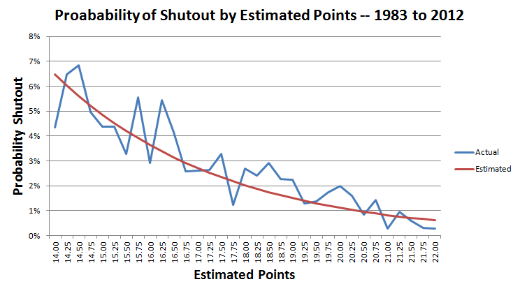 接下来,让我们根据1983年至2012赛季的数据,根据每支球队的预计得分来计算完封的概率。我跳过了样本量为零的行。