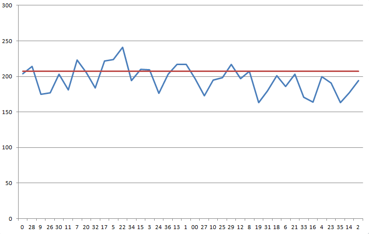 下图按顺序显示了您在轮盘上的结果。蓝线表示您的结果。红线表示您需要的数字 207.11,以克服 5.26% 的赌场优势。
