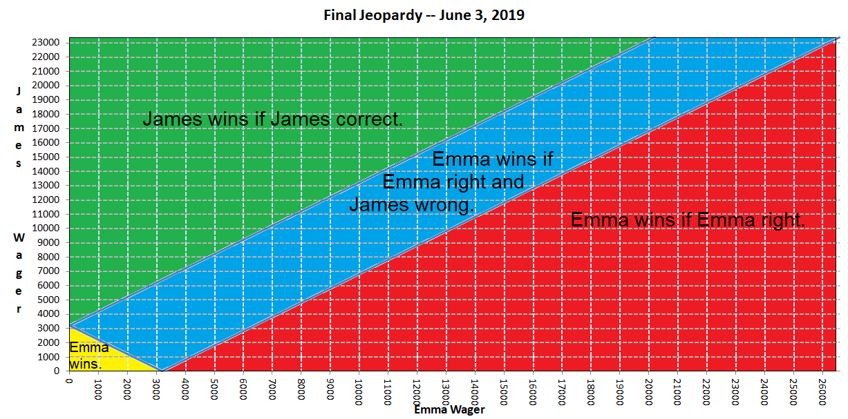 在这种情况下,第二名的奖金超过第一名的一半,而第三名的奖金却不足一半,通常就取决于第一名和第二名最终的投注金额是高还是低。如果投注金额高,第一名的奖金就足以锁定胜局。具体来说,投注金额是第二名得分的两倍减去第一名得分加上一美元。这正是艾玛投注金额的方式,投注金额为 2×23,400 美元 - 26,600 美元 + 1 美元 = 20,201 美元。大多数情况下,第一名的玩家都会这样做。