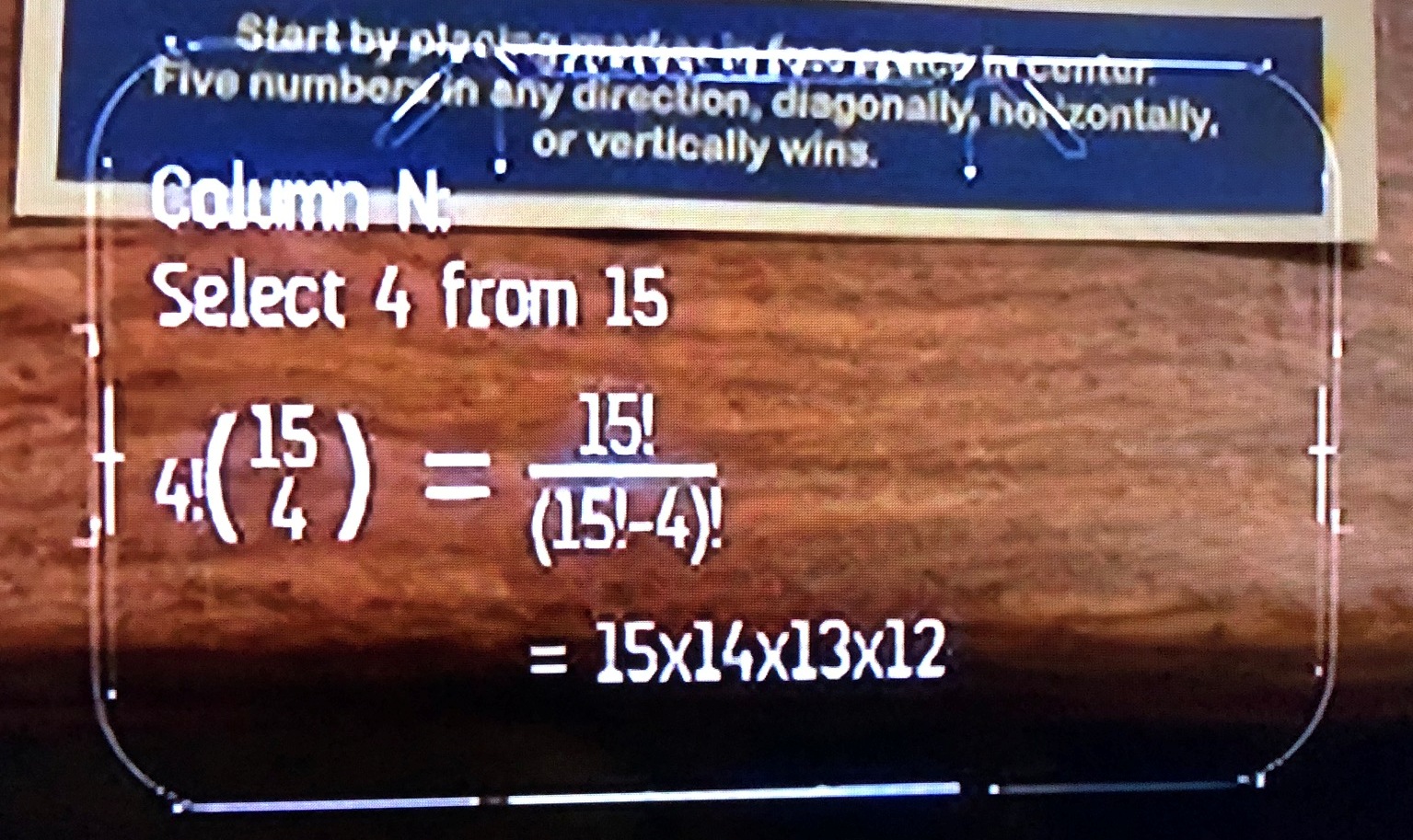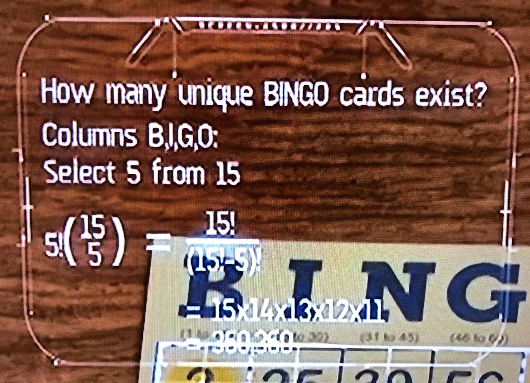 首先,我来介绍一下排列数。这意味着不仅数字重要,它们在卡片上的顺序也很重要。对于 B、I、G 和 O 列,可能的排列数为 permut(15,5) = 15!/(15-5)! = 15*14*13*12*11 = 360,360。对于 N 列,排列数为 permut(14,4) = 15!/(15-4)! = 15*14*13*12 = 32,760。因此,宾果卡的排列总数为 360,360 (4 × 32,760) = 552446474061128648601600000。