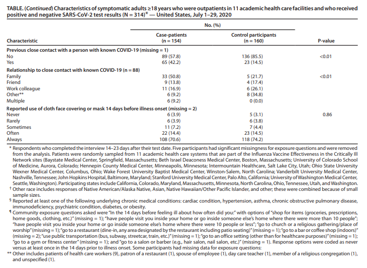 85% 指的是美国疾病控制与预防中心 (CDC) 发布的《美国 11 家门诊医疗机构中 18 岁以上有症状成年人与 COVID-19 相关的社区和密切接触暴露情况报告》(2020 年 7 月)第 4 页的表格。表格如下。