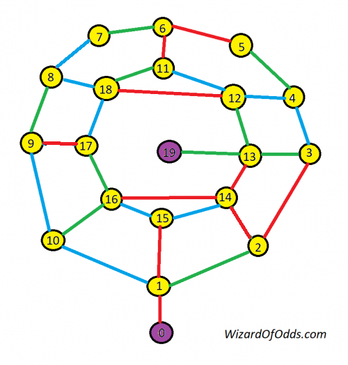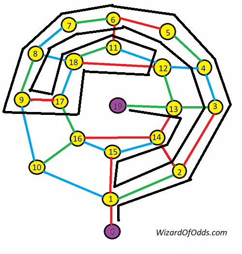 你的任务是从0号方格走到19号方格。你不能连续两次走同一种颜色的路径。换句话说,你必须在每个方格换一条颜色不同的路径。不能掉头。答案是什么?
