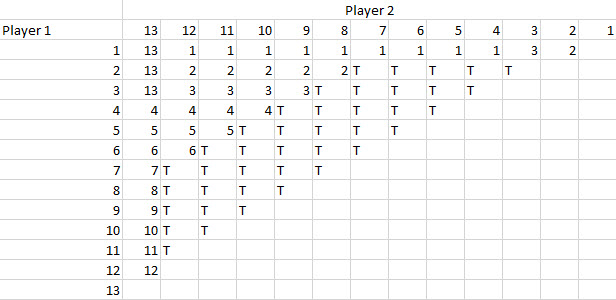 下表展示了这种情况可能发生的一种情况。表格主体部分显示了全部78场比赛的获胜者。