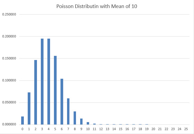 我选择泊松假设的原因是,当均值足够大时,它遵循近似钟形曲线的形状,并且实际结果永远不会低于零。