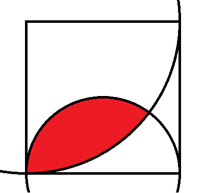 上面的正方形边长为2。一条弧线代表半径为1的圆,另一条弧线代表半径为2的圆。红色区域的面积是多少?可以用三角函数来表示你的答案。