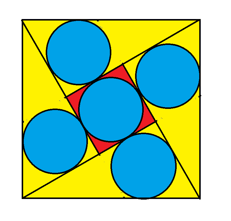上图由四个直角三角形和一个大正方形内嵌的小正方形组成。大正方形的边长为1。五个圆的直径相同。半径是多少?