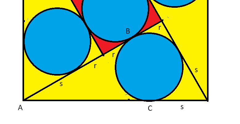 我们需要另一个方程来解决这个问题。我们先来看一下大正方形的边长,已知它是1。AB = AC。AB = 2r+s,所以 AC = 2r+s。大正方形的剩余边长是s。所以: