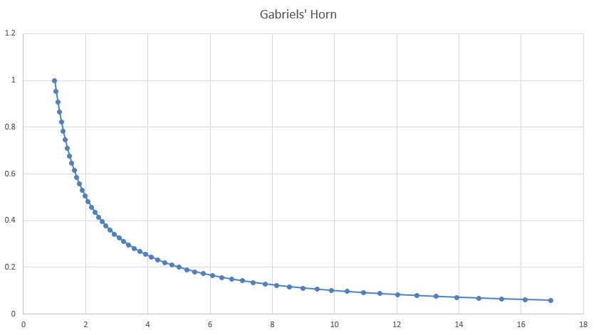 接下来,想象一下这条曲线绕着 x 轴旋转。它会形成一个像号角一样的形状,末端无限长。这就是数学家所说的加布里埃尔号角?
