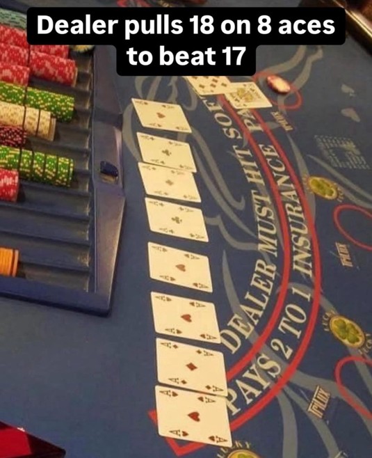 我在推特上看到这张图片。庄家发到八张A的概率是多少?