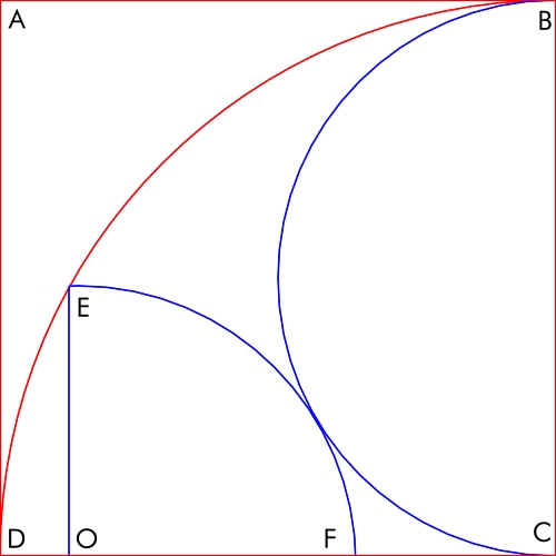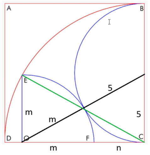 如图所示,ABCD 是一个边长为 10 的正方形。在其内部分别内切了一个半圆和一个四分之一圆。
