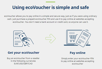 正如其官方网站直接指出的那样,ecoVoucher 是一项预付费电子支付服务,允许用户尽可能快速安全地转账。此外,该解决方案还有一项更强大的功能,那就是为您的 ecoAccount(更准确地说是您的ecoPayz)充值。