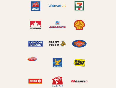 一些最受欢迎的商店包括沃尔玛、7Eleven、壳牌、Dollar General、Petro-Canada、Jean Coutu、London Drugs、Giant Tiger、Corner Store、Express Mart、Ultramar、百思买、Circle K、Couche-ard、EBGames、Fields.ca、Fine Foods、Pharmasave 和 Mac's。