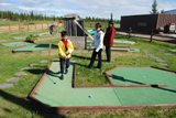 6月16日早上,我像往常一样晨跑,注意到一个迷你高尔夫球场(在东海岸,也就是所谓的“迷你高尔夫球场”)和一个可以租独木舟的湖泊。这个迷你高尔夫球场与黑钻“午夜阳光”高尔夫球场相连,我真想去那里打打球。我们在俱乐部享用了美味的早餐,还附赠了免费的迷你高尔夫球场。迷你高尔夫球场有点破旧,球洞里长满了草,但阿拉斯加主题的球洞仍然让打球充满乐趣。