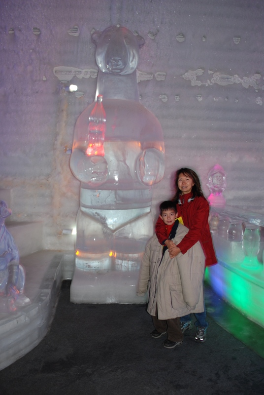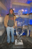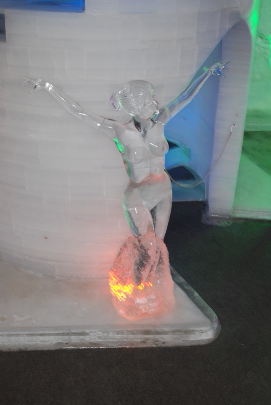 冰雪博物馆每天定时开放参观。馆内大约有十几座不同的冰雕。导游来到莎拉·佩林的冰雕前,开玩笑说它的大小和温度都和真人一样。馆内冰吧出售用冰块制成的杯子装的苹果马提尼,售价15美元,我没花太多钱。