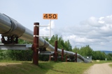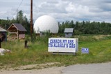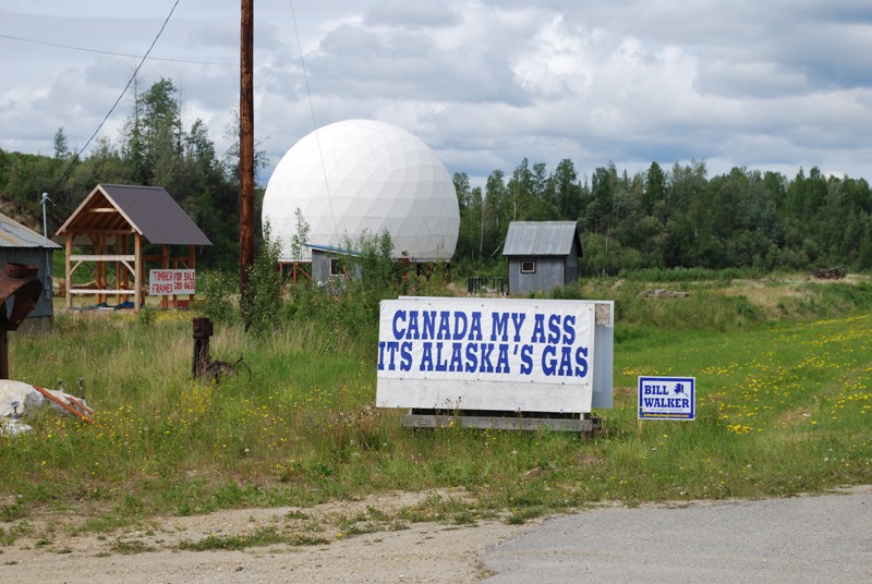 在我看来,阿拉斯加输油管道是美国最伟大的工程成就之一,所以第一次看到它时我感到很自豪。高速公路对面有一块巨大的标牌,上面写着:“操你丫的加拿大,这是阿拉斯加的天然气。”这句话我在旅途中读了好几次。它指的是修建第二条天然气管道的双重方案:一条短管道连接到加拿大的一条管道;或者一条长管道,沿着现有的石油管道原路修建。