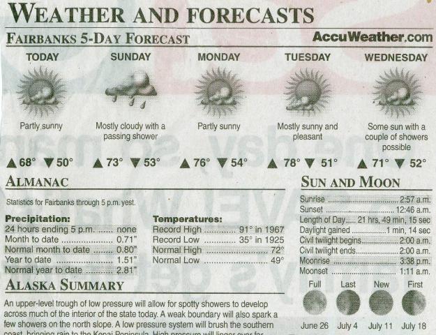 通常,当人们提到“午夜太阳”时,他们指的是太阳不会落山。这种情况只会在一年中的某些时间发生在北极圈以南和南极圈以南。费尔班克斯仍然位于北极圈以南约200英里处,所以即使在一年中白天最长的一天,太阳也会落山。尽管正如我在阿拉斯加游记第二部分中所解释的那样,在日落和日出之间的几个小时里,外面仍然相当明亮。正如这份剪报所示,那天在费尔班克斯,太阳在凌晨12:46落下,凌晨2:57升起,日照时间长达21小时49分钟。这距离“一年中白天最长的一天”还差两天。所以,这次跑步的标题有点用词不当,但谁在乎呢?