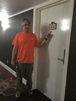 这其实是我在布里克尔湾的房间。这算什么?我穿长裤的唯一原因是我正要去机场,要在波士顿转机,那里的气温远低于零度。