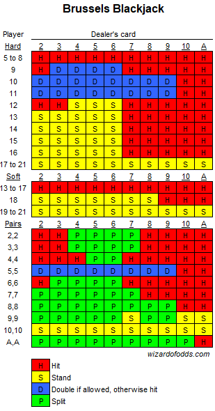 在这些规则下,赌场优势大约是3-2游戏中最高的0.75%。以下是适合这些规则的基本策略。