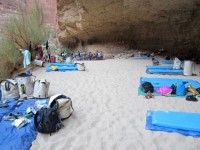 OARS 提供每位客人 50 美元的睡眠包。我注意到其他客人都选择了这个选项。我本来计划给 Aidan 和我自己带睡眠包,但出发前几天,OARS 的人说我们最后一天用来拖运装备的骡子已经订满了,问我是否介意第二天把多余的装备拖过来寄给我。作为回报,他们允许我们免费使用两套睡眠包。反正旅行结束后一段时间内我也用不着这些装备,所以我就答应了。睡眠套装包括睡袋、床单和枕头。他们还给了我们一个充气睡垫,是预充好的。晚上太暖和了,一开始我只是睡在睡袋上,床单下面。然而,到了凌晨两点左右,我就会觉得冷,就钻进睡袋里。