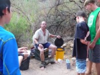 第六天一大早,阿曼达就去营地把大家叫醒了,早上五点就醒了。那一晚真是辗转反侧。半夜时分,我儿子抱怨说,感觉浑身都像是被虫子咬了一样,尽管他身上没有任何虫子,他还把水洒在了我第二天要穿的干衣服上。我不知道他当时是睡得怎么样,就发生了这一切。五点钟,我赶紧叫醒艾丹,收拾好行李,几分钟内狼吞虎咽地吃下尽可能多的燕麦粥。然后我们乘船短途前往幻影牧场下游的派普溪(Pipe Creek)。我听说他们通常会把客人送到幻影牧场,但阿曼达想缩短徒步时间,这次下山就缩短了两英里。我儿子很失望我们错过了幻影牧场,因为他在学校读过一本关于幻影牧场的书,非常感兴趣,尤其是对据说栖息在那里的隐形蝎子。不过,我们有理由再来一次。