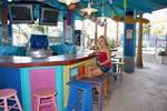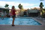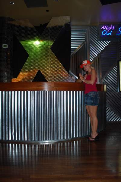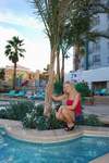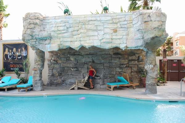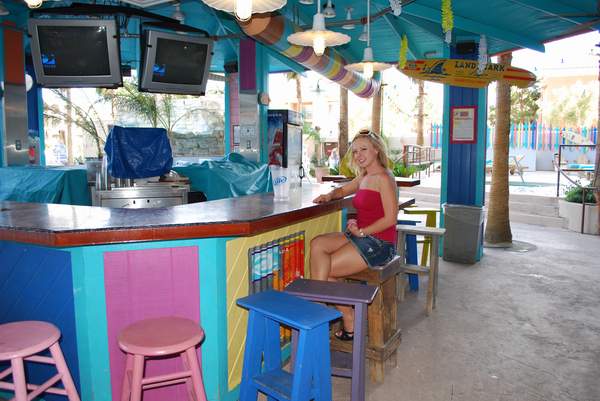 Hooters 酒店配备了一个规模相当可观的泳池,就其规模而言。酒店实际上有三个泳池和两个水疗中心。泳池周围摆放着大约 50 张躺椅、十几棵棕榈树、一小片沙地和一个瀑布。我和丽莎拍照的时候,瀑布没有喷水,但一周后我再次入住时,瀑布又开始流水了。附近有“Nipper”的户外酒吧可以喝酒,但我拍照的时候它已经关门了。
