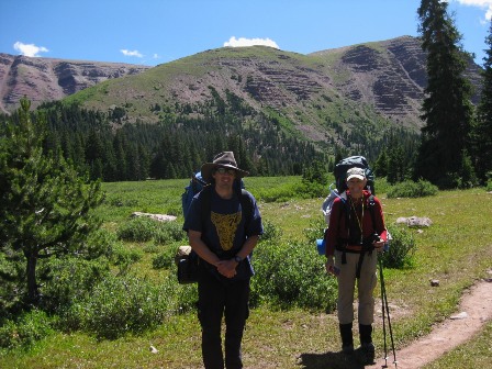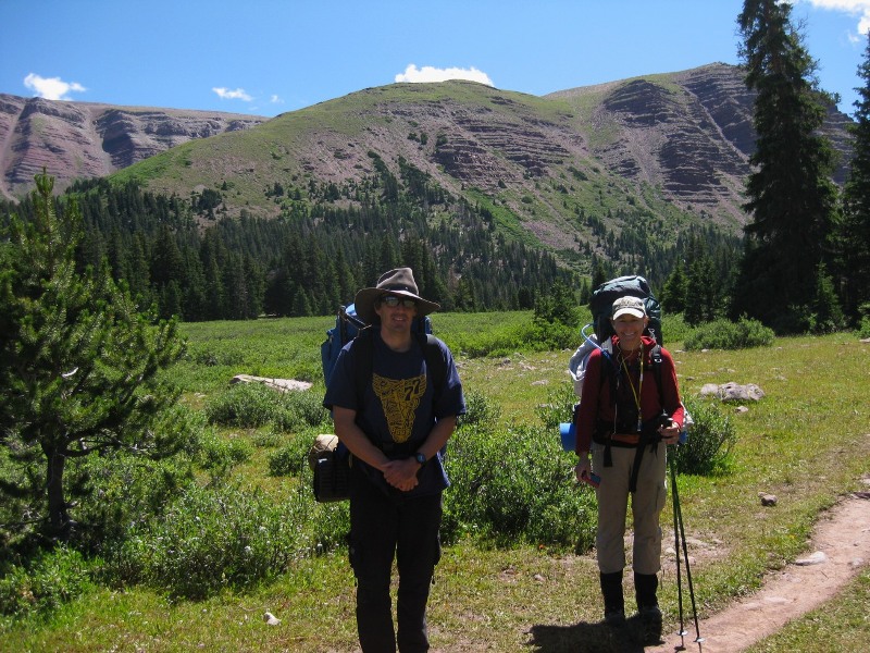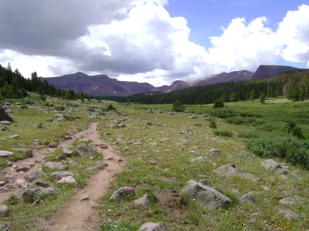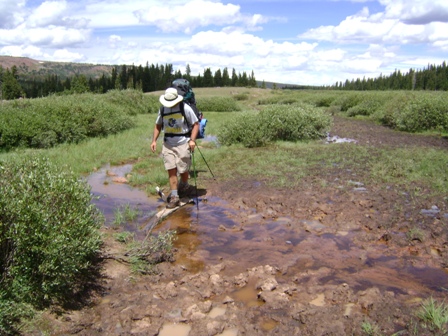 过河后,小路穿过几条长长的草木茂盛的排水沟。与此同时,山势渐高,树木渐矮。在我看来,这是徒步中最美的一段风景。然而,穿越排水沟的代价是,有些路段泥泞不堪,我费力地把脚从泥里拔出来,差点把靴子拔出来。在前往美元湖的途中,我们遇到了至少100名迎面而来的徒步旅行者。几乎所有人都看起来二十出头,很多人手里拿着鱼竿。我担心美元湖地区会因为路上人流太多而变得拥挤不堪。