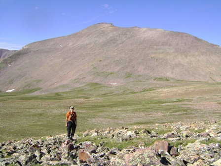周日,我们又早早出发,准备征服吉尔伯特峰。它就在我们营地上方,海拔仅比国王峰略低。绕过多勒湖后,我们继续沿着陡峭的山路向上攀登。然后,我们沿着一片长满草木、散落着岩石的高原顶部徒步前行。天气阴沉,风很大。哈兰说,这段徒步经历让他想起了最近去苏格兰的旅行。从我对《勇敢的心》的记忆来看,我不得不承认,我们确实感觉自己身处苏格兰高地。