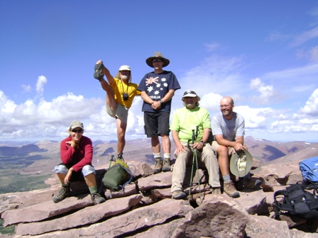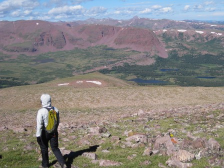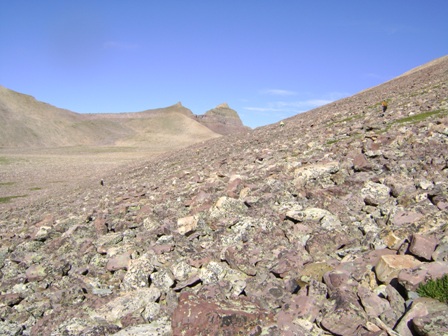 星期六,我们早早出发,试图避开乔尔警告我们通常会在下午遇到的暴风雨。我们开始向南行驶,直到排水沟的尽头。在此期间,我的背包出了故障。我用了 25 年的旧背包的左肩带松了。幸运的是,准备充分的哈兰有一条备用鞋带,我用它来弥补丢失的铆钉的问题。然后我们翻越了 Gunsight Notch。过了这里,我们和国王峰之间正好隔着一个美丽的山谷。我们走过这个美丽的平坦山谷了吗?没有……一定是有人在我们右边另一座山峰边缘的岩石中立了一些石堆。我们被这些假石堆欺骗了,花了一个小时的时间在岩石上徒劳地爬行。