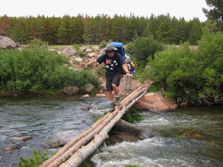 第二天早上,我们出发前往美元湖畔的下一个露营地。这一天很轻松,行程约八英里,海拔上升约1000英尺。小路始于高大的松树林,沿着亨利福克河蜿蜒而行。大约三英里后,我们来到一座被冲毁的桥边,他必须从这里过河。在我们之前,有人把三根细木捆在一起,我们勇敢地跨了过去。实际上,我可能是唯一一个感到紧张的人。其他人走过去的速度几乎与平常一样慢,就像在走一条六英尺宽的人行道一样。