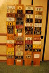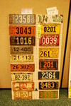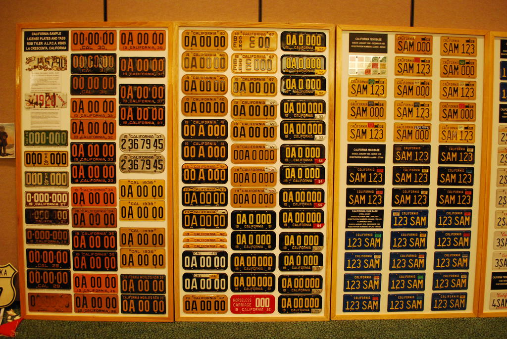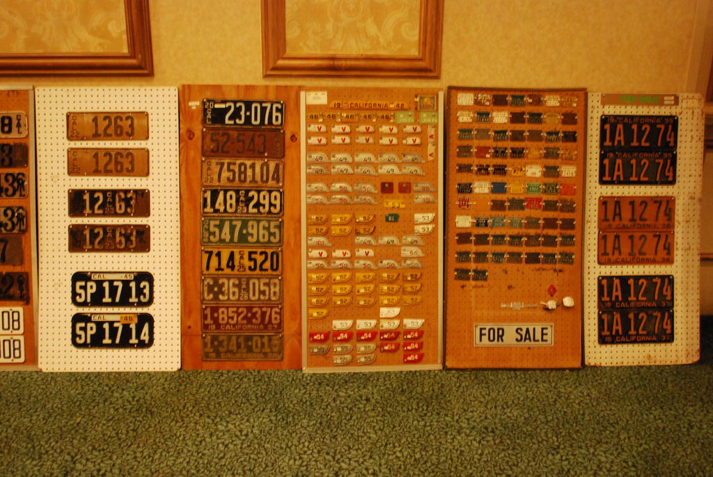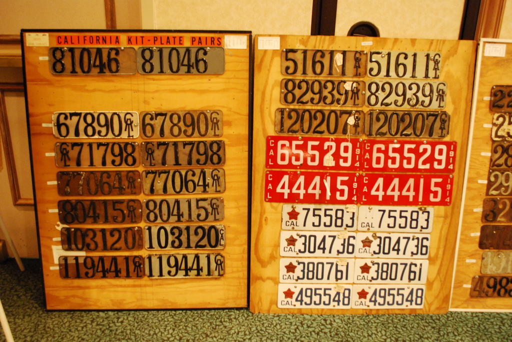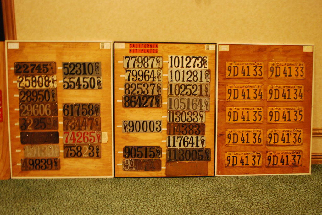 令人印象深刻的加州老车牌收藏。这些“套装车牌”来自1905年至1913年,当时加州不提供车牌,而是告诉你号码,你必须自己制作。五金店出售用于制作车牌的套装,通常由一块金属片或一块金属网以及门牌号组成。