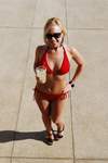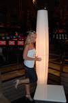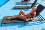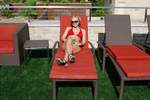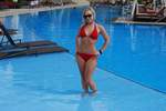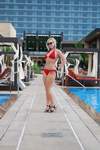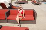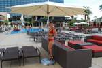 我必须承认:我对Lisa(如下图所示)的关注远多于泳池本身。泳池的设计颇为独特。从甲板上看,它看起来像一个泳池,中间有岛式小屋。实际上,岛式小屋和连接它们的通道将水分成了两个泳池。此外,还有两个大型水疗中心,以及一个通往21岁以上人士专用泳池的入口,入口处有守卫。如果说欧式(上身裸露)日光浴是其中的一部分,那么很遗憾,我没有看到任何女性行使这项权利。不过,我倒是很喜欢乒乓球和桌上足球。