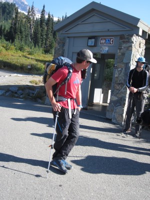 第三天早上8点开始。我们先和第三位导游Lance见面。现在我们的队伍已经完整了——八位客人和三位导游。Tyler带领的平行队伍人数相同。我们再次乘坐RMI巴士前往雷尼尔山脚,这次是开始攀登。当天的目标是到达缪尔营地,它位于半山腰。缪尔营地距离停车场只有4.4英里,所以看起来这一天相当轻松。