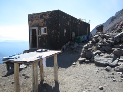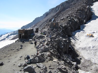 我们下午2点半左右到达缪尔营地。营地是一排简朴的建筑,位于最后一片雪原之上,冰川开始之前。营地里有两间简易宿舍——一间由两家向导公司共用,另一间供公众使用。此外,营地里还有户外厕所、一间带锁的护林员宿舍、一间小型向导小屋,以及一些正在建设中的其他建筑。这是一个放松身心、尽情享用美食、为即将到来的重要一天做准备的好时机。在这段时间里,向导们用鼹鼠皮膏给客人的脚上水泡敷上,并给其他客人的脚上贴上了大量的防水胶带*。