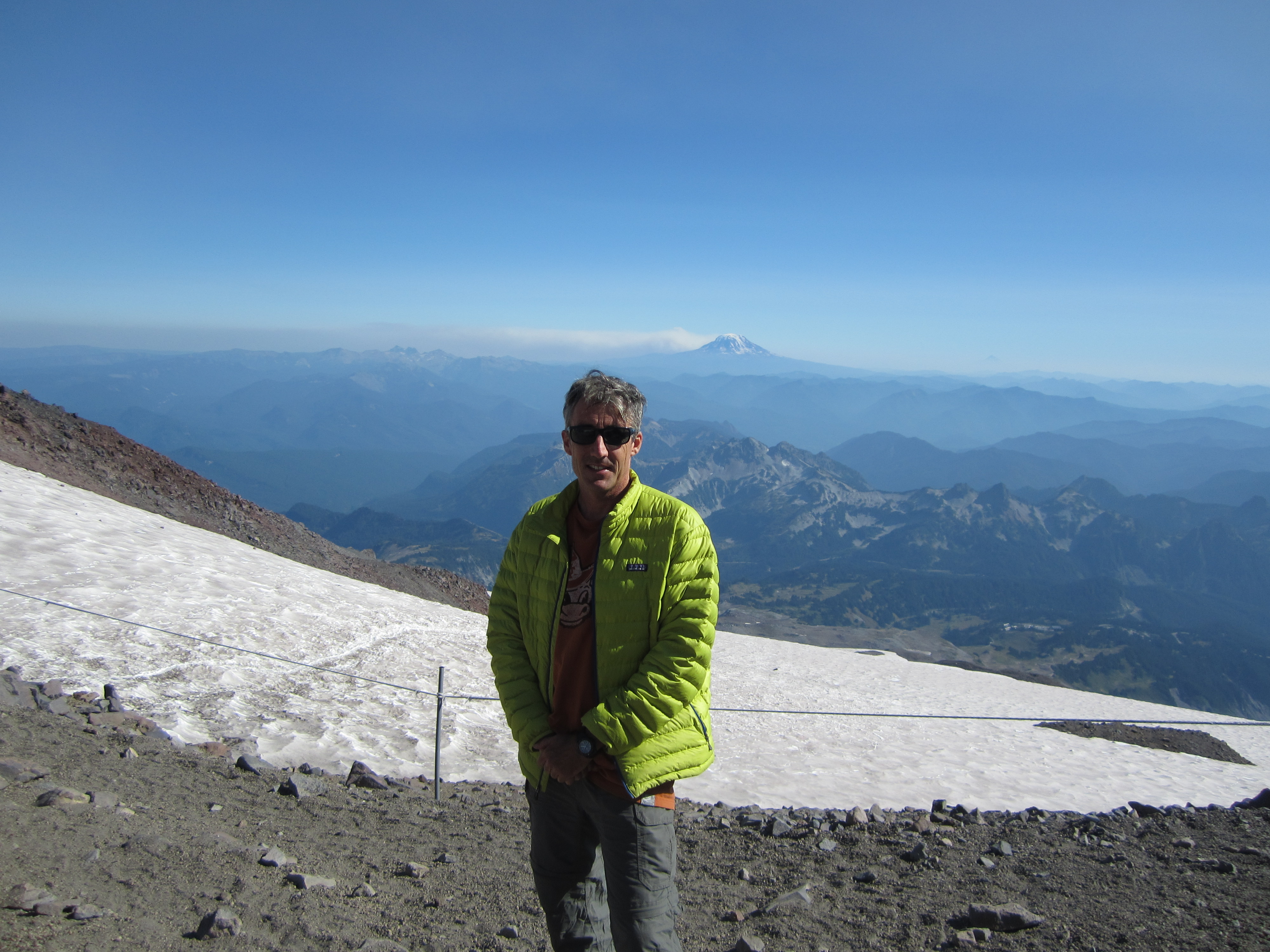 让我先说一句,如果有人到达了火山口,我就觉得他已经登上了雷尼尔山。然而,我知道我会被问到好几次是否登顶,我不想含糊其辞。所以,为了获得额外的学分,以及欣赏雷尼尔山以北包括贝克山在内的壮丽景色,我一路走到了位于最高点的地质调查标记处和附近的山顶登记处。