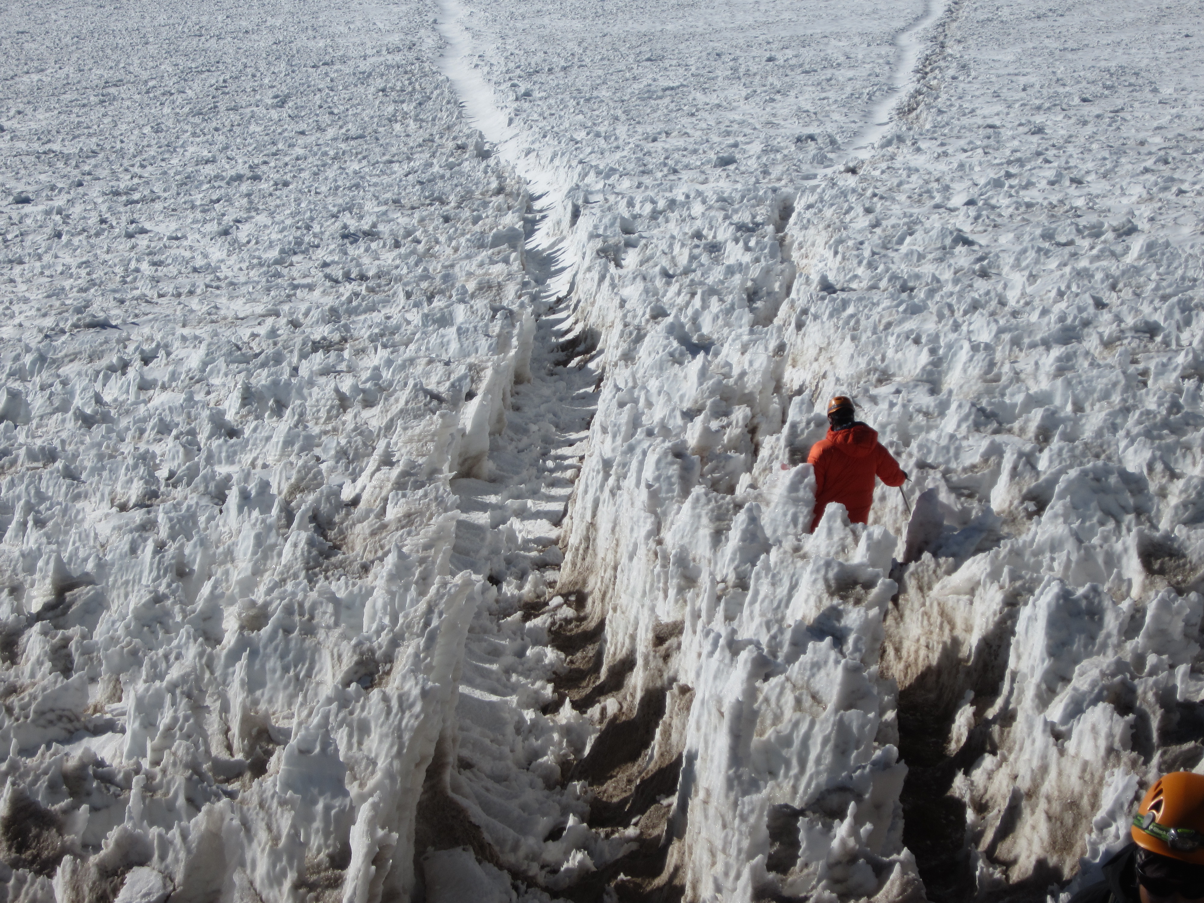 接下来的四个小时左右,我们进行了和我两个月前在胡德山上训练一样的训练。主要是学习如何使用冰镐防止坠落,以及如何作为绳索队的一员行走。在这次训练中,我的一个冰爪(攀冰时固定在靴子底部的钉子)掉了。我知道实际攀登时我们的时间安排会很紧凑,没有时间让冰爪故障拖慢大家的速度。