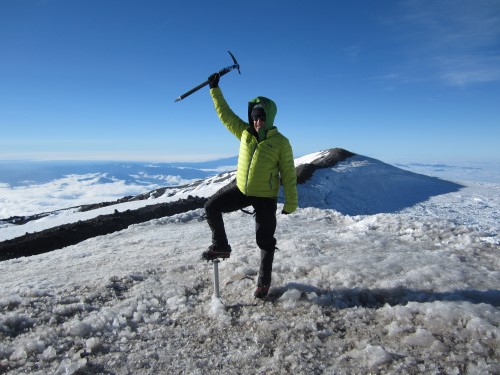 终于,我的三人绳索小组到达了火山口边缘,并下到了火山口内。景色美极了。那一刻,所有的辛苦都值得了。火山口是一片巨大的圆形雪原,周围环绕着岩石边缘和喷气孔。山顶的天气再好不过了。天气略冷,风也略有微风——冷到足以让你想起身处何方,但又不会冷到让你感到不舒服。
