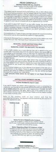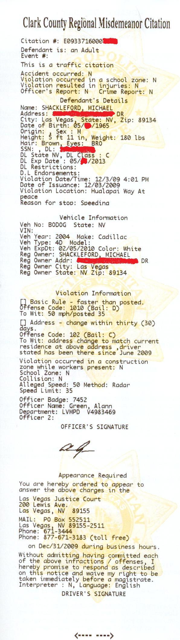 回家后,我联系了Ticket Whackers。拉斯维加斯到处都有类似Ticket Whackers这样的法律服务机构,可以对抗交通罚单。我听说他们会把罚单降到“违章停车”的级别,这样罚款会少一些,而且不会在记录上加分。至于他们是怎么做到的,我至今仍不太清楚。我在我的“拉斯维加斯巫师”网站上询问了这个问题,得到了很多好评,但没有直接联系到任何熟悉内华达州交通法庭的人。