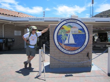7月21日,星期一,早上10:45,我们乘坐渡轮从圣佩德罗前往阿瓦隆。我大约30年没去过阿瓦隆了,我儿子也从来没去过,所以我们花了一点时间四处走走,吃了午饭。我们还去了卡塔利娜岛保护区(地址:克拉丽莎大道125号),取了一张岛上的徒步地图。岛上的步道通常标识不清,所以强烈建议携带一张详细的地图。岛屿保护区出售一张不错的防水地图,售价3美元。你也可以在那里免费获得徒步许可证,我之前就是通过他们的网站申请的。我知道儿子背着轻便的背包,一天只能徒步7到9英里。不过,我想大多数从阿瓦隆出发的成年人,都会从小道的起点(卵石滩)出发,徒步14英里到达黑杰克营地。但我们的情况不一样,因为我儿子根本走不了那么远,尤其是考虑到我们第一天出发得晚。