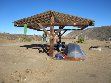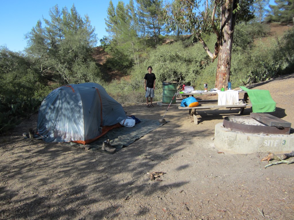 营地本身是一个漂亮的小营地,坐落在卡塔利娜岛内陆高地的树荫下。每个营地都配有一张野餐桌,靠近水龙头。户外厕所也相当干净整洁。我们到达时,只有另外一组露营者。我注意到一只卡塔利娜岛狐狸在他们的营地附近徘徊,显然是在寻找偷食或被喂食的机会。