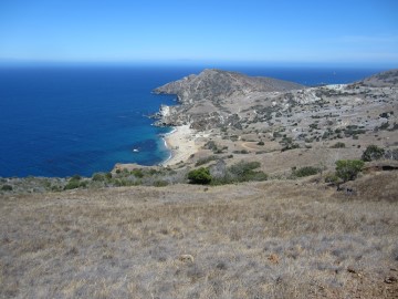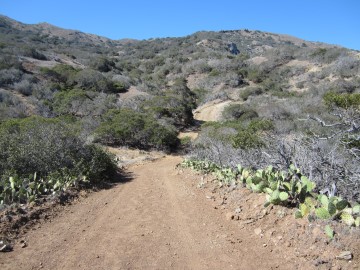 这一段路是整条步道中最轻松的一段。这是一条开阔的土路,缓缓下降,直达海平面的小港。因为我儿子坐的是班车,所以我帮他把沉重的行李装上背包,很快就到了小港。这段步道可以欣赏到岛屿东侧和太平洋的壮丽景色。它离左边的一家酒庄也很近,考虑到卡塔利娜岛地处偏远且水资源匮乏,我甚至很惊讶那里竟然有酒庄。